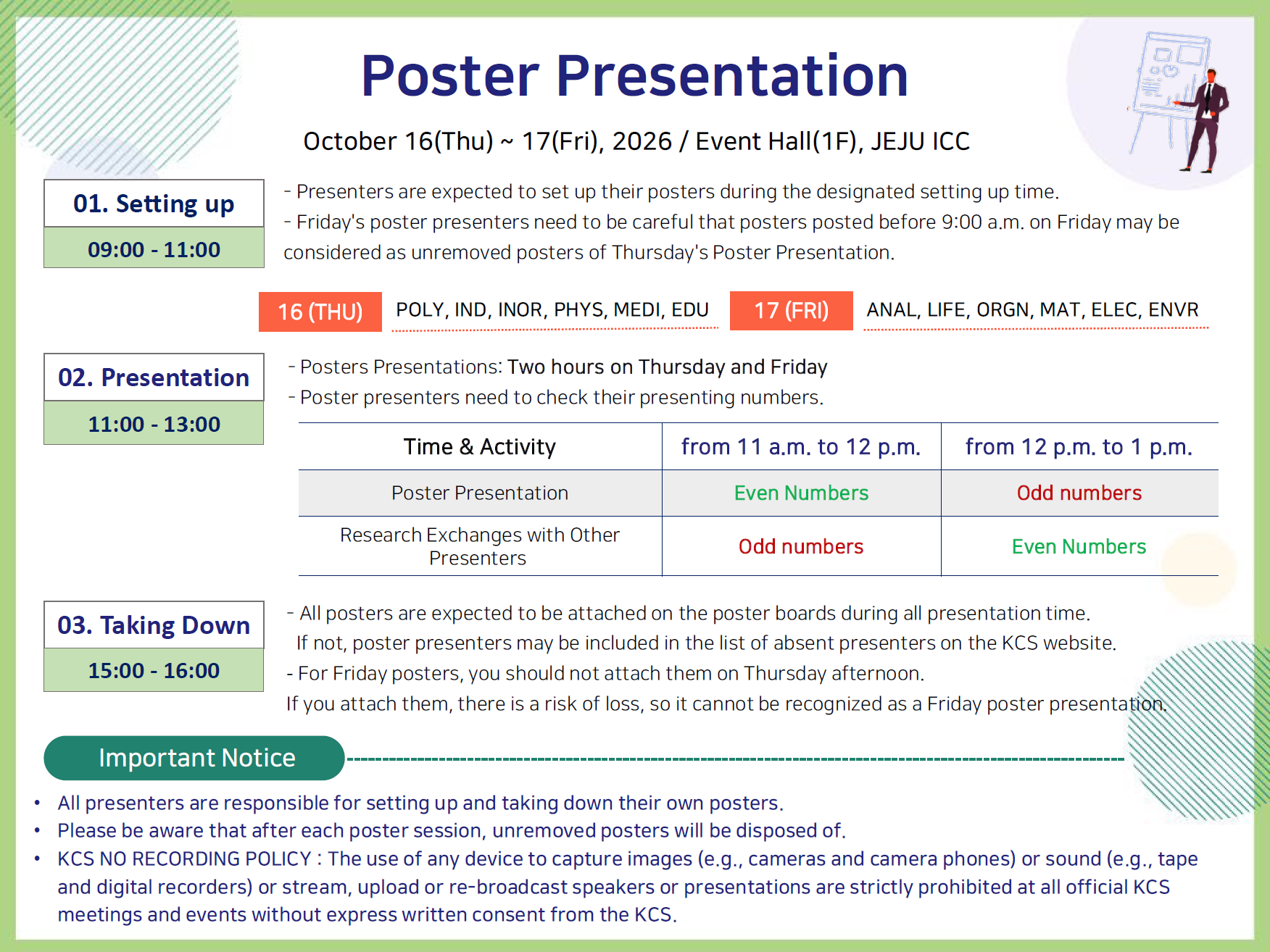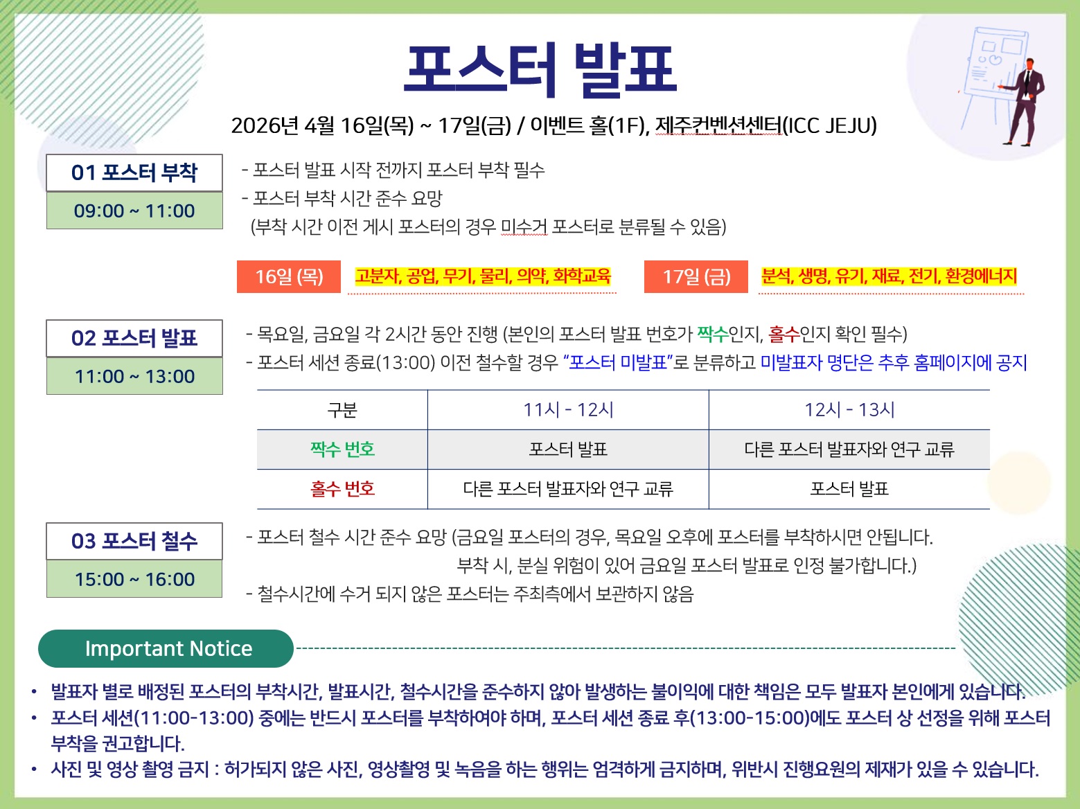 - 발표시간 외에 발표자는 다른 포스터 발표자와 연구교류를 할 수 있음